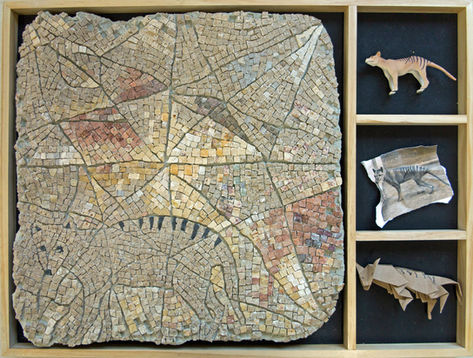 Many works referenced Australian animals which are either endangered or extinct, so remaining only in memory or representation. I started with an origami model of the animal then unfolded it. The mosaic was dictated by the unfolded origami shape and the colour choices reflected the colours of the original animal.
